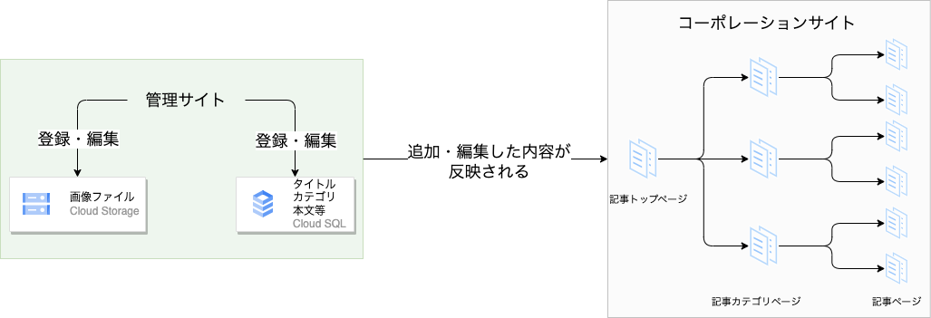 管理サイトで、記事の内容や、画像を登録すると、GCP(Google Cloud Platform)に保存されます。